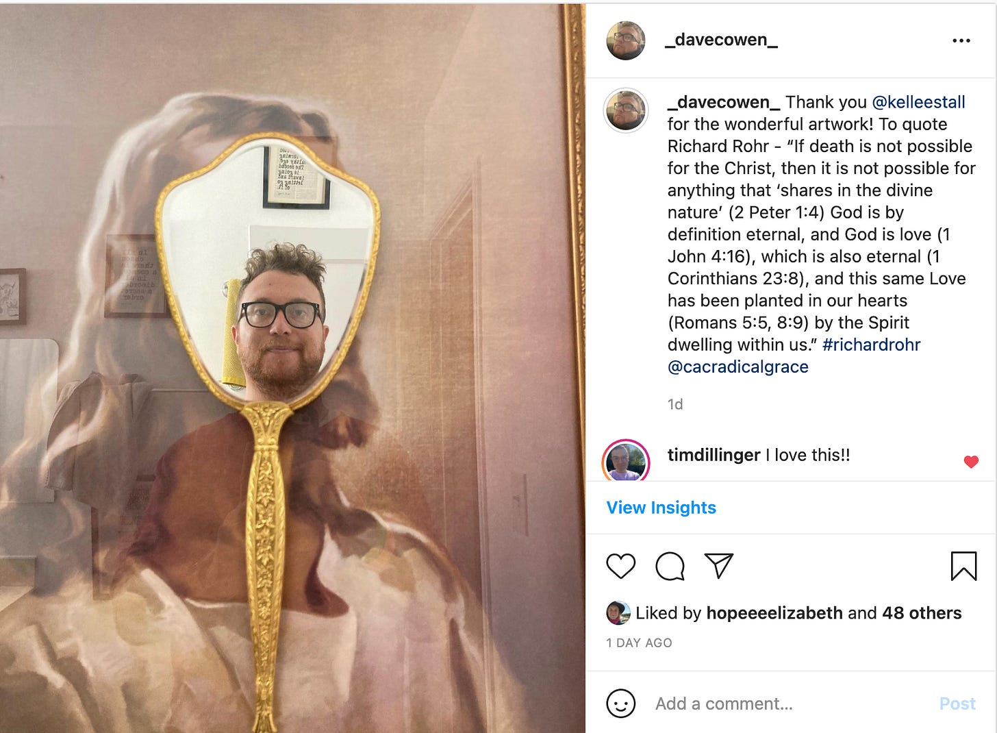 I told Kellee that I plan to take a similar photo of anyone who visits my home with their face in the mirror and pair it with more Richard Rohr quotes for a further art project.