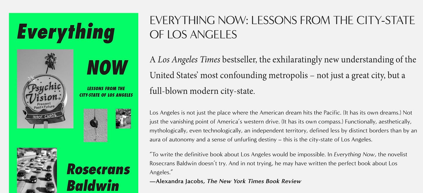 Today I’ve come out of my month-long sabbatical because we have a very special guest post submitted by Rosecrans Baldwin, who is the author of perhaps the best recent book on LA and certainly my favorite: Everything Now: Lessons from the City-State of Los Angeles!