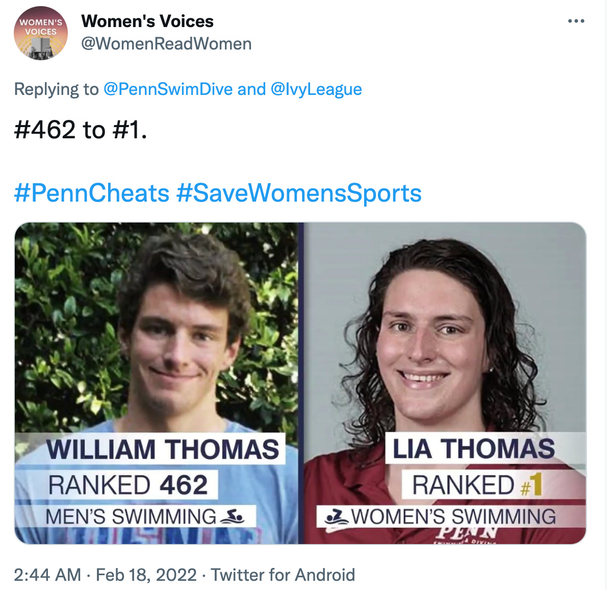 Then someone on a group text I’m on mocked the Trans swimmer 🏊♀️ from my college, Penn, who is winning all the female records.