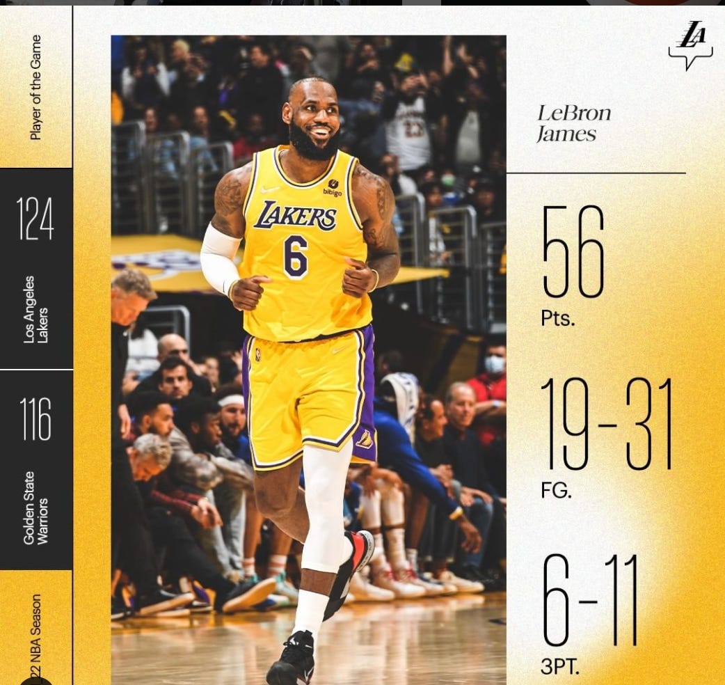 LeBron put on a show. 56 points. Tied for the most in a game this season in the NBA and his third-highest total in his career as the soon-to-be second-most points-scored-player in history… and the Lakers won …