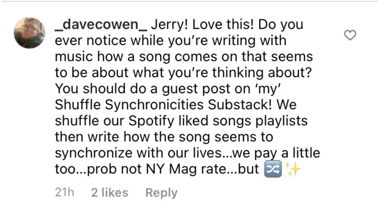 So with that in mind, we’ll be adding a button for people to write about Shuffle Synchronicities they may have noticed in their own life recently.