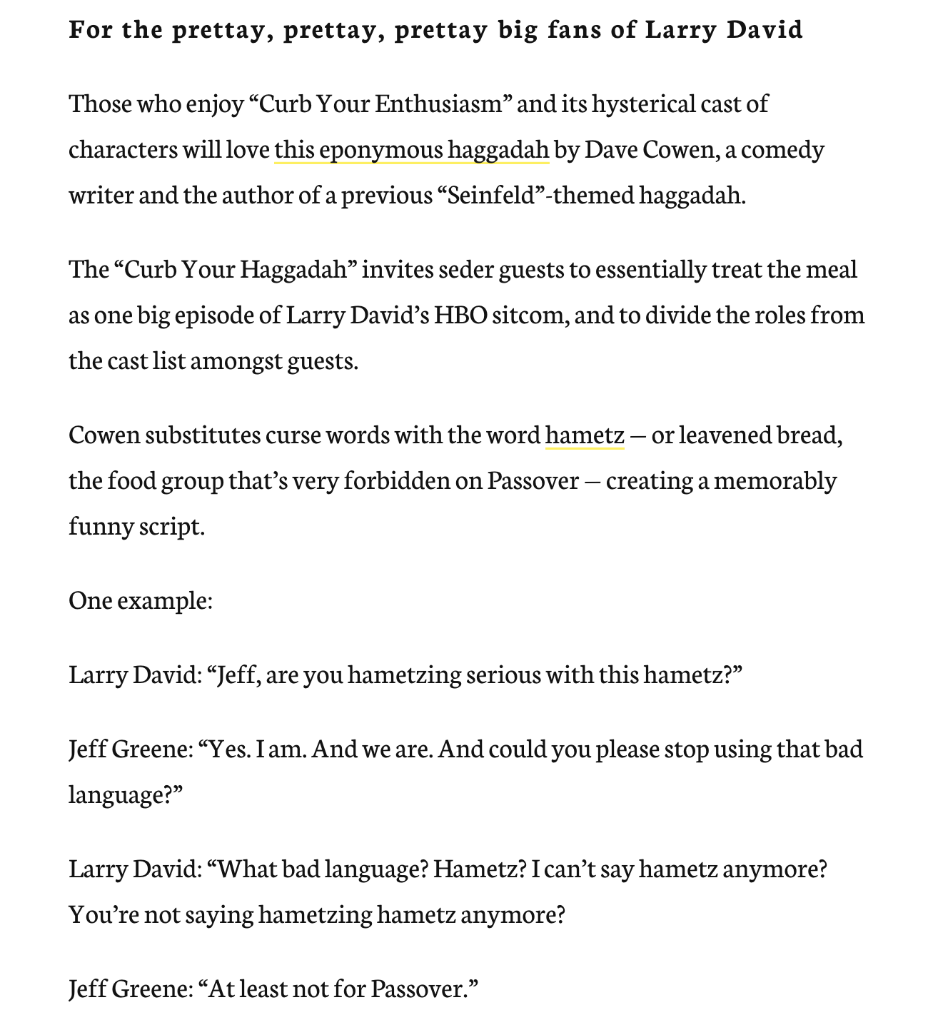 In not completely related ‘me’ news, my Curb Your Haggadah has gotten some Jewish Press.