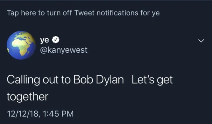 Like you wouldn't be that surprised. Probably their audience agrees with, some portion of their audience, would agree with them. It's these, both of these people that are, in different ways, um, thought of as progressive, you know, Kanye musically at the forefront of, you know, so much music for so long. Bob Dylan musically. And, and politically, even though he sort of pushed away from that, he certainly has been identified with progressive causes since the Sixties. So having people like this.