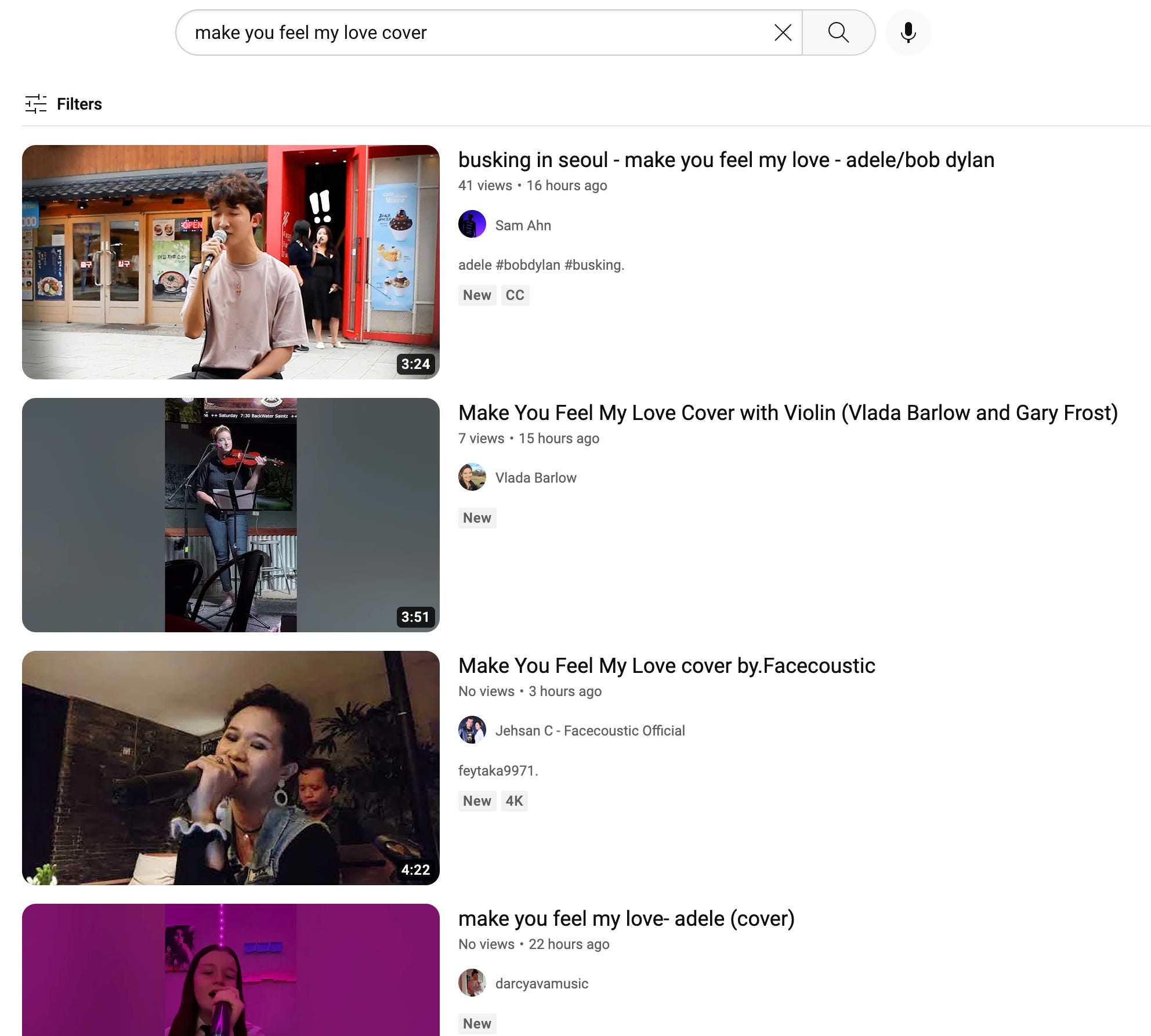 The moment I searched, and I'm sure that's true, anytime you search Make You Feel My Love. Do it right now. Make You Feel My Love. If you're listening <laugh> or curious, Make You Feel My Love cover filter 24 hours, there's gonna be a bunch of new ones. It's that sort of song. It's like an American standard now.