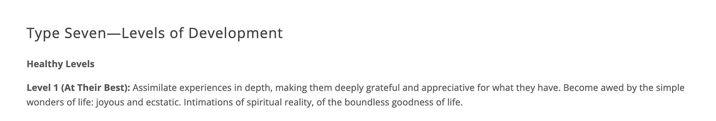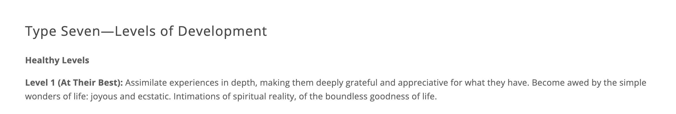 And…I'm trying to articulate this…like, if I'm late for a concert in the past, like my old self, before I had all these changes, I would be so <laugh> irritated and anxious and like whoever's with me is like, it's a problem for them to be with me. Because I'm like, we gotta fucking get to this show. And so we were eating dinner and when I'm, when I'm in the manic state, it's like every moment is the same, perfectness, and it doesn't matter where you are. And I think that kind of speaks to like Enneagram 7, like the Be Here Now thing. Every moment is joyful.